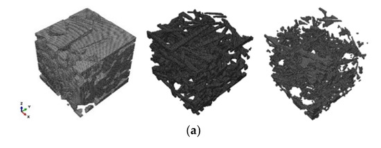 The fiber network was generated by the commercial software GeoDict’s Fiber-guess module through the random modeling process. The randomly distributed GDL fiber network was generated using the voxel mesh technique. The star length distribution (SLD) method was used to obtain the overall fiber orientation tensor for the unit-cell. The SLD approach analyzes a voxel’s length for predefined directions. The components of the fiber orientation unit vector n = (nx, ny, nz) are calculated by SLD [54,55,56,57]. The tensor was averaged over all voxels contained in the unit-cell. The overall average tensor is derived to overcome the difficulty of considering the direction for each distributed discontinuous carbon fiber. The fibers were modeled as circular rods with a length of l = 200 μm and a diameter of d = 10 μm. The resolution is 100, corresponding to a voxel length of 2 μm. Initial fiber volume fraction is 17.89%. The domain size is 100 × 100 × 100 (200 μm × 200 μm × 200 μm). Additionally, the Young’s moduli and Poisson’s ratios of the matrix and of the fibers are set to Em = 3.12 GPa, υm = 0.38, Ef = 230 GPa and υf = 0.2, respectively. The phase contrast of this combination amounts to ς = 73.7.