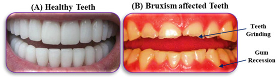 Comparison between (A) healthy and (B) bruxism teeth of the human. The grinding of the tooth is shown in the case of bruxism.