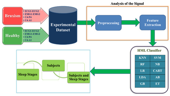 We propose a new detection system for bruxism using the extraction of power spectral density on physiological sleep recordings such as ECG (ECG1-ECG2), EMG (EMG1-EMG2), and EEG (C4-P4 and C4-A1). Initially, the physiological signal is extracted from the sleep database. The 10/20 standard sleep recording system recorded these data. It is used in the research work of sleep disorders such as circadian rhythm sleep disorders, insomnia [33,34,35,36,37], bruxism [38,39,40], sleep apnea, restless leg syndrome, narcolepsy [41], and nocturnal frontal lobe epilepsy [42]. We preprocessed the signals using a low-pass finite impulse response (FIR) filter to remove the noise of the signal. After filtering the signal, we estimated the power spectral density of the signals. Finally, we classified the sleep stages (w and REM) [43,44], subjects (bruxism and healthy), and combined subjects (bruxism and healthy) and sleep stages (w and REM) from the novel hybrid machine learning (HML) classifier. The proposed hybrid classifier is the combination of ten machine learning classifiers, namely K-nearest neighbor (KNN), support vector machine (SVM), random forest (RF), naive Bayes (NB), linear regression (LR), classification and regression tree (CART), linear discriminant analysis (LDA), AdaBoost (AB), gradient boosting (GB), and extra trees (ET). There are two common issues in the previous research of bruxism. Firstly, there is a large number of features used in the studies, which results in a high computational load. Secondly, most of these methods did not represent a classification with sleep stages. We address these challenges in this study. Further, we focus on some goals, including estimation of the power spectral density, applying the novel HML classifier for the classification methods on the same feature, and comparison between the HML classifier and different previously used classifiers. The proposed study is organized as follows: the used database is presented in Section 2. The feature extraction and novel classification methods are presented in Section 3. The evaluation of the results and related discussion are presented in Section 4. Finally, the conclusions of this paper are presented in Section 5.