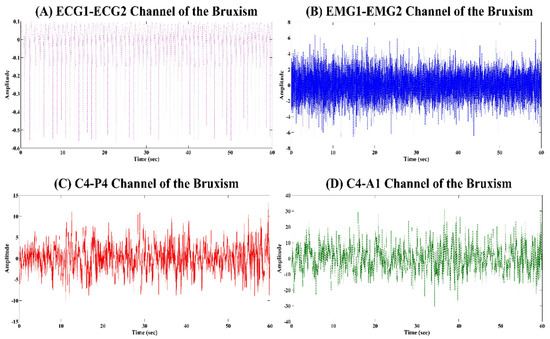 Signal representation of the sixty-second sleep physiological channels such as (A) ECG1-ECG2, (B) EMG1-EMG2, (C) C4-P4, and (D) C4-A1 of the bruxism subjects. A 10/20 standard sleep recording system recorded them.