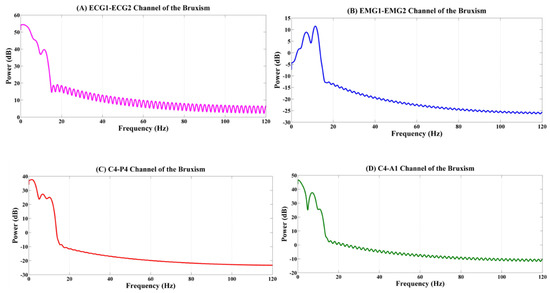Power spectral analysis of the channels such as (A) the ECG1-ECG2 channel, (B) EMG1-EMG2 channel, (C) C4-P4 channel, and (D) C4-A1 channel of the bruxism subjects.