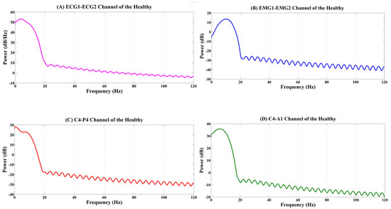 Power spectral analysis of the channels such as (A) the ECG1-ECG2 channel, (B) EMG1-EMG2 channel, (C) C4-P4 channel, and (D) C4-A1 channel of the healthy subjects.