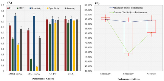 Performance analysis of the subjects (bruxism and healthy) classification using the novel 20-fold HML classifier. (A) Comparison between all channels such as EMG1-EMG2, ECG1, ECG2, C4-P4, and C4-A1 channels of the subjects classification. In addition, (B) highest and mean performance of the subjects classification. The C4-A1 channel of the EEG signal has the highest accuracy (94%) in the subjects classification.