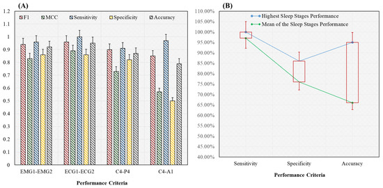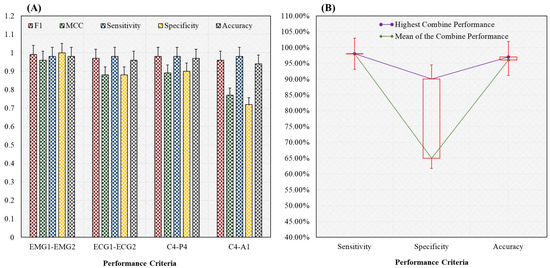 Performance analysis for the combination of subjects (bruxism and healthy) and sleep stages (w and REM) classification using the novel 20-fold HML classifier. (A) Comparison between all channels such as EMG1-EMG2, ECG1, ECG2, C4-P4, and C4-A1 channels of the sleep stages classification. In addition, (B) highest and mean performance of the combined classification. The C4-P4 channel of the EEG signal has the highest accuracy (97%) in the combined classification.