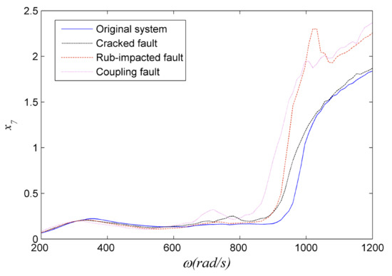 The crack and coupling faults have greater effect to the motion state near the primary resonance. Moreover, the rub-impact fault has more obvious effect to the vibration amplitude at the frequency of primary resonance. The variations of the dynamical characteristics in Figure 5, Figure 6 and Figure 7 can provide theory guidance to the fault diagnosis of the non-linear rotor-bearing system.