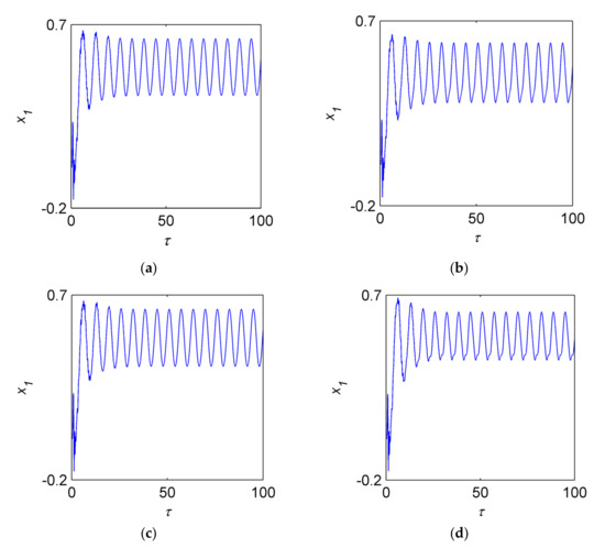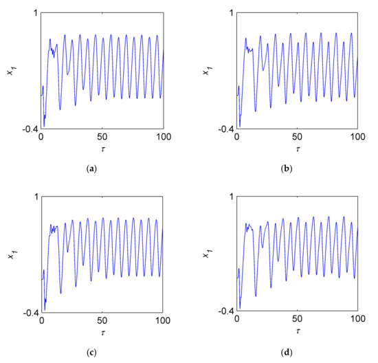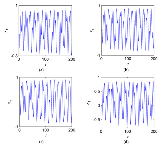 When (nearby the primary resonance), the time history curves of the four systems are drawn clearly in Figure 5. The curves contain both the transient and steady-state processes. The transient process of the oil-filmed system (Figure 5a) vanishes in about two periods, the other three systems (Figure 5b–d) need three periods. This indicates that the stability of the system with faults can’t be kept in comparison to the normal system. Meanwhile, in Figure 5d, the steady-state signal of the coupling fault is not standard sinusoidal, which has a visible difference in the other three systems.