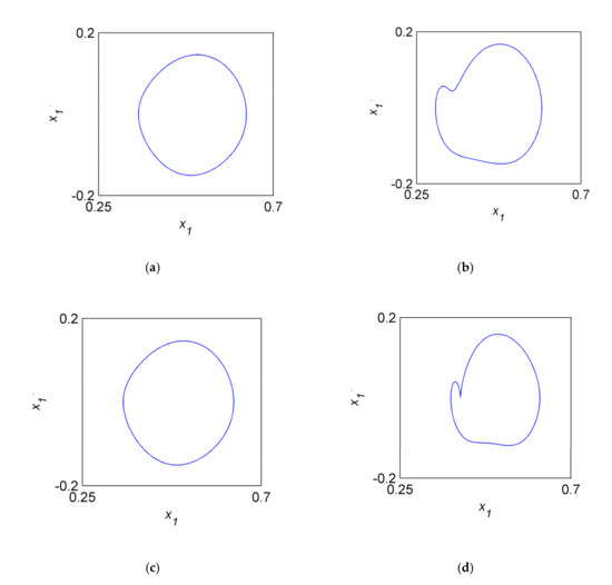 The phase portraits of when . (a) The oil-filmed system. (b) The cracked system. (c) The rub-impacted system. (d) The coupled system.