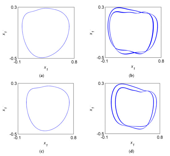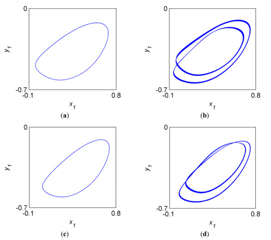 Figure 9 analyzes the trajectories of the orbit of shaft center of the four different system when . The motion curves of the oil-filmed and rub-impact systems (Figure 9a,c) are similar to ellipse. In comparison to Figure 9a,c, double-loop curves are embodied in the cracked and coupling systems. There is one intersection in the cracked system and two intersections in the coupling system, this result indicates that the crack fault is a key factor in the appearance of double-loop curves at . The rub-impact fault may affect the topological structures of the double-loop curves.