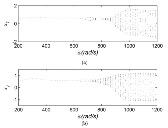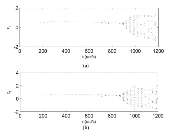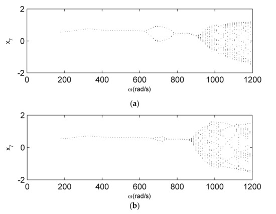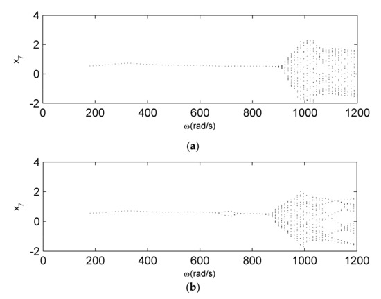 The effect of the cracked depth variation on dynamical characteristics of the coupling fault is investigated in this section. As is shown in Figure 14a,b, they reflect the bifurcation diagrams of the coupling fault systems with the cracked depth and . Figure 15 shows the comparison of frequency-amplitude curves of two cracked depths. As the cracked depth decreases, the stiffness variation decreases correspondingly, so the first order critical speed of the coupling fault rotor slightly increases. The period-doubling bifurcation vanishes at the frequency of , the 1/2 sub-harmonic vibration amplitude of the relevant amplitude–frequency characteristic decreases at the same time (Figure 15). Since the crack fault characteristic does not play the main role and even vanishes, the rub-impact fault emerges, the vibration amplitude suddenly increases at the frequency of . This change demonstrates the crack is the main factor to generate 1/2 sub-harmonic vibration in the coupling system again, there will be more effect with the increase of the cracked depth. The rub-impact fault will result in the amplitude of the coupling fault peaking at the frequency of , there is reversible inhibition of the crack to the amplitude aroused by the rub-impact. The restrain will be stronger as the cracked depth increases. When , the cracked depth will have little impact to the amplitude based on the comparison of the amplitude–frequency curves (Figure 15). In comparison to the bifurcation diagrams (Figure 14), the complex motion state of the system changes.