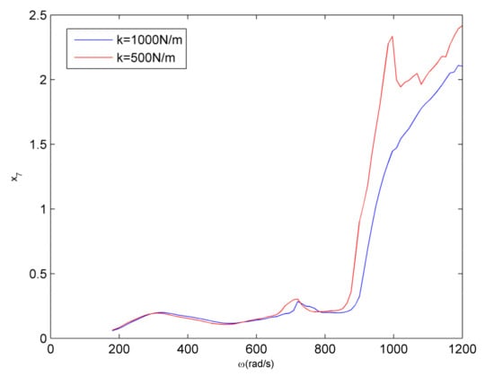 The effects of the stator stiffness variation to the bifurcation behaviors and amplitude–frequency are studied in this section. We select two different parameter values to discuss the comparison of bifurcation (Figure 18) and amplitude–frequency (Figure 19) of the coupling fault system: the first is , the second is . In Figure 19, we can see clearly that the variation of the stator stiffness has little impact on the primary frequency, vibration amplitude and critical speed. 1/2 sub-harmonic resonance amplitude increases as the stiffness decreases. At the frequency of , the amplitude changes obviously when the stiffness decreases. The complex motion region is simpler when the stiffness is .