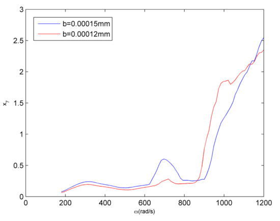 Finally, we study the effects of the eccentricity variation to the coupling fault system. Figure 20 and Figure 21 present the comparison of bifurcation and amplitude–frequency of two different eccentricities (0.00015 mm and 0.00012 mm). As is shown in Figure 21, the amplitude increases when the eccentricity magnifies at the frequency of primary resonance. 1/2 sub-harmonic resonance is more obvious near the frequency of , it is clear that the annulus of the period-doubling bifurcation is larger. When the frequency is over , the amplitude decreases as the eccentricity increases, this result indicates that increasing the eccentricity appropriately can improve the stability of the system under a certain speed. However, in the high frequency region, the bifurcation behaviors will be more complex when the eccentricity increases, in other words, the non-linear dynamic characteristics will be more complex. As is discussed above, the eccentricity of the system has more impact to dynamical characteristic of the amplitude–frequency and bifurcation at the frequencies of primary resonance, , high frequency. The eccentricity may affect the visualizations of different faults at each frequency range.
