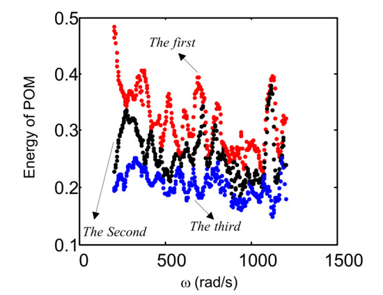 In Figure 22, it shows the first three order POM energy curve of the 24-DOFs rotor model with the coupling fault. It is clear that the three order POMs occupy 98.7% energy when the rotating speed is about 1120 , so we can obtain the optimal order reduction model at this speed based on the POM energy method. The POM energy method has been applied in Ref. [50], then we use the TPOD method in Section 2.1 to reduce the 24-DOFs rotor model to a 3-DOFs one.