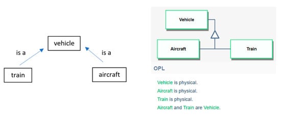 Figure 1 is an example of the difference between a concept map (left) and an OPM conceptual model (right). Both diagrams express the fact that a train and an aircraft are vehicles. Since concept maps are limited to concepts (graph nodes) and relations between them (graph edges), one has to specify textually the relation along each edge. In Figure 1, the two relations are “is a”. In the OPD on the right, a dedicated symbol, the blank triangle, is used to denote the “is a” relation, which in OPM is called generalization-specialization. Moreover, since OPM is bimodal, implying that each fact is modeled both graphically and textually, using the OPM modeling software OPCloud [], OPM provides an automatic textual interpretation of the graphical representation that the modeler provides. Each symbol has a specific syntax and semantics. In this example, the blank triangle in the OPM model, which expresses the generalization-specialization relation, provides for using inheritance. Bold indicates names of objects or processes in the OPM model. Thus, if we assign to the object Vehicle the attribute Traveling Medium, this attribute is automatically inherited to its Train and Aircraft specializations, so the respective attribute values land and air can be assigned to them (not shown). The formality of conceptual models provides a more rigorous knowledge representing than that of concept maps, but proper use of a conceptual modeling language requires some learning to use it properly.