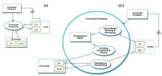 Object-Process Methodology (OPM) is a formal conceptual modeling and language methodology for model-based systems engineering and conceptual modeling of systems, with a recognition by ISO 19450:2015 []. Each OPM element is defined as either a thing or a link. Things are objects, which can be either physical or informatical, and processes—things that happen to objects and transform them. A process transforms one or more objects by creating new objects, consuming existing objects or affect existing objects by changing their state. Objects may have states that are changed by processes. Links define structural or procedural relations between things, and each kind of link has well-defined semantics. OPM models are represented in a tree-structured hierarchy of object-process diagrams–OPDs. SD, the system diagram, is the root of the OPD tree and the highest level of abstraction. It depicts the main system’s function—a combination of a main process and one or more objects—which the process transforms. SD also includes the beneficiary—a person or a group of people—and the benefit providing attribute—the beneficiary’s attribute whose change from its input state to the output state provides the benefit that the system delivers. The top-level diagram, SD, is refined into the first detail level, SD1, which is a more detailed view of SD, elaborating on the combination of the structural, behavioral, and functional aspects of the system. The refinement can continue similarly to further levels of detail, but deeper levels beyond SD1 were not used in this research. The OPM modeling process enables systematic thinking as it is conducive to a top-down approach, in which one has to first model the beneficiary, purpose, and benefit of the system as achieved by its function, which, in turn, is a combination of a process and the operands it transforms. Figure 2 depicts an OPM model of the Chocolate Producing process. The top level, called the system diagram (SD), appears on the left of Figure 2, and the first level of detail (SD1) appears on the right, in which the process is in-zoomed. SD1 exposes its three inner subprocesses and interim object (Cocoa Beans Batch).