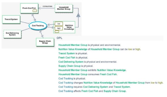 The main process in the model in Figure 3 is Cod Tracking, which changes the Nutrition Value Knowledge of the Household Member Group from low to high. This is the benefit of the Cod Tracking process. Links in OPM are of several kinds. For example, in Figure 3, the double arrowhead link between the process Cod Tracking and the object Supply Chain Group is an effect link, implying that the process affects the object. The “white lollipop” between TRACOD System and Cod Tracking is an instrument link, implying that TRACOD System is required for Cod Tracking. These facts are also expressed textually in the same figure.