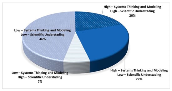 We classified the participants according to their systems thinking, modeling, and scientific understanding levels. Participants whose systems thinking and modeling levels were at least 8 were classified as high while others were classified as low. Similarly, participants whose scientific understanding level scored at least 8 were classified as high while others were classified as low. Figure 5 presents the distribution of students according to their systems thinking and modeling skill levels and their scientific understanding level in four groups.