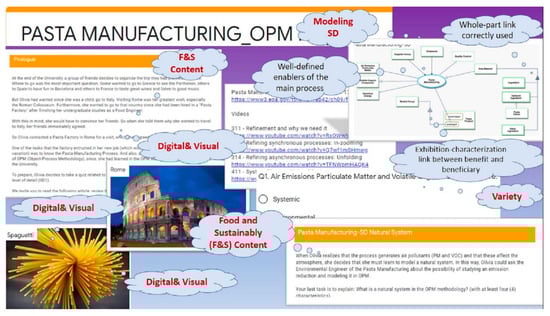 The first research question was: How can a complex food production process be modeled and evaluated? Modeling these processes requires system thinking which is developed while learning conceptual modeling with Object Process Methodology (OPM) using OPCloud. A trans-disciplinary team is needed to build such a model. Once built, the model can serve as part of learning materials for modeling context-based narratives focusing on environmental and food-related issues [,,].