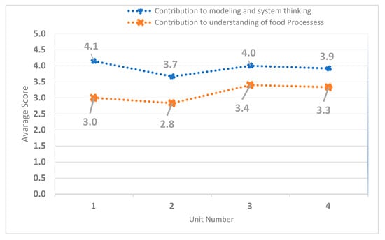Figure 8 presents analysis of the students’ feedback regarding contributions of the course to the understanding of modeling and systems thinking as well as understanding of food processes, by the learning units, based on their Likert scale statements. The graphs show that students’ perceptions of the contribution of the course to their systems thinking and modeling is consistently higher than to understanding food processes, with both showing a similar trend.