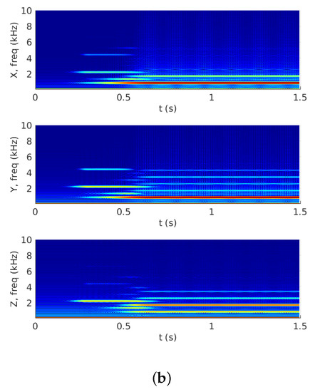 The advantage of this wavelet decomposition is that the change of scale is here logarithmic, whereas it was linear for the windowed Fourier transform. This affects the shape of the observation cells in the space . Assuming that the function has zero mean, a standard deviation and its Fourier transform centered around with a standard deviation of , the cells described by different wavelets of the form cover the area , as illustrated in Figure 5b. It is clearly shown that when the observation scale s is small, the spatial resolution is coarse, while the frequency resolution is fine. When the observation scale s increases, the spatial resolution becomes finer but the frequency domain also increases in size. The spatial resolution is therefore not the same from one scale to another. It is perfectly suited to the study of non-stationary signals composed of several frequency components by making it possible to locate specific frequency components in the signal.