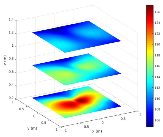 Acoustic patterns in dB for the steady state vibration regime (for t > 1 s) on different horizontal planes at 0.25 m, 0.75 m and 1.25 m.
