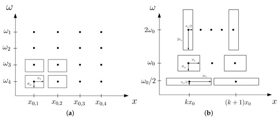 By defining and as the standard deviations associated with the functions g and , respectively, the uncertainty principle applied to the function g implies the following relation . This inequality defines the compromise to be made between spatial and frequency resolutions. Figure 5a illustrates this inequality in the 2D dimension . which only allows for the description of f around the point and for an interval . Thus cells of constant area and identical form are defined. This regular decomposition thus imposes that the discretization in frequencies of the studied problem is also regular and uniform. All the frequency intervals are therefore of the same size and they are distributed linearly, which therefore imposes a compromise between the spatial and temporal refinements of the windowing function g. In our study, the signals to be analyzed are composed of non-uniformly distributed frequencies, which makes the windowed Fourier transform unsuitable.