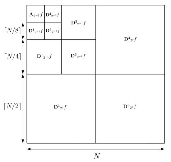 where J corresponds to the number of iterations for the decomposition of the original image. Figure 6 illustrates the decomposition process and the disposition of , , and for three iterations.