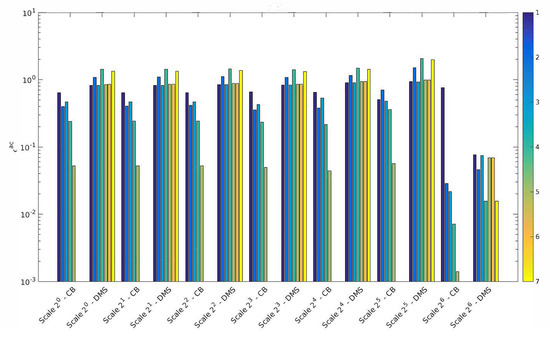 Values of for —horizontal planes (definition of the color bar for “Scale 2—CB”: 1 , 2 , 3 , 4 , 5 ; definition of the color bar for “Scale 2—DMS”: 1 , 2 , 3 , 4 , 5 , 6 , 7 .