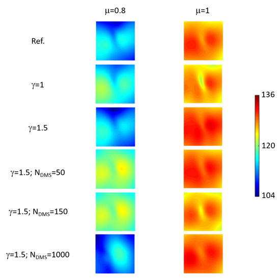 Figure 7 and Figure 8 give the evolution of at , depending of the size of the C&B basis as well as DMS basis for the acoustic patterns during the steady state vibration regime on the three horizontal planes (at 0.25 m, 0.75 m and 1.25 m, as previously defined in Figure 3) and the two vertical planes (as previously defined in Figure 4), respectively. It should be noted that each size of the C&B reduction (i.e., the value of ) and each size of the DMS reduction (the value of ) is associated with the color bar and the definitions of the color bar are explained in the legend of Figure 7 and Figure 8.