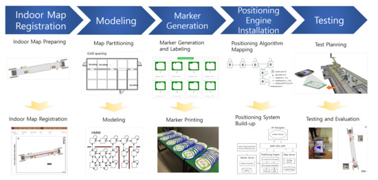 Prior to describing the HMIPS, we formulate the process of installing an HMIPS in a subway station. Distributing the HMIPS to subway stations requires a number of steps. Figure 1 illustrates the overall process of deploying a marker-based indoor positioning system in a subway station. In the first step, an indoor map of the subway station is prepared to provide an indoor positioning service and it is then registered in the system. In the second step, indoor space modeling proceeds using more advanced techniques for marker generation and installation, after which markers are generated and printed for the modeled area using a marker-making tool (step three). Once the generation of markers has been completed, a positioning engine is installed in step four. Afterward, testing and evaluation are performed to ensure the quality of the provided indoor positioning system (step five). The following sections describe the detailed activities required at each step.