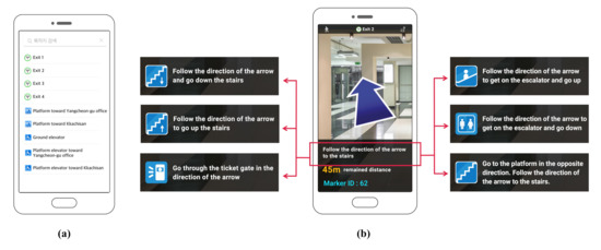 The HMIPS recognizes the marker ID and passes the destination with the marker ID information to the database when the user selects a destination and places a marker on the camera, as shown in Figure 6. The AR-based navigation app provided to the user allows the user to enter a destination, as shown in Figure 6a. When the destination input is completed, the direction of progress is guided by arrows, as shown in Figure 6b, and the remaining distance to the destination is displayed along with the POI guide of the place to proceed to, via text. The database uses the received information to return the direction to the destination based on the front of the marker. At this point, each marker provides a direction for consecutive markers that are passed by the user approaching the destination. Each marker does not point in the direction of the destination but is indicative of another marker in the direction of the destination relative to itself. (Note that user tracking between markers uses PDR to indicate the direction of progress with arrows, but this points to the next marker.) This direction information is provided from the HMIPS to AR, and the direction of movement from the marker at the current position to the next marker is indicated by an arrow.