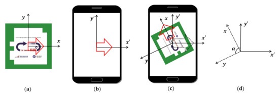 In AR-based indoor navigation, two reference axes are required to display the moving direction of a user with a rotating arrow. One is the axis based on the marker, as shown in Figure 7a and the other is the axis based on the camera screen, as shown in Figure 7b. Because pedestrians do not always use the camera in front of the markers, dynamically calculating the direction of the next marker on a pedestrian basis is necessary. The direction calculation for navigation uses the angle information of the y-axis of the marker, direction of the next marker, y’ axis of the camera, and y-axis of the marker, as shown in Figure 7. When guiding to the destination, the angle of the marker is calculated clockwise to provide the direction of the next marker. If the y’ axis of the camera and the y-axis of the markers do not match, the angle difference is dynamically calculated to reset the destination direction. Without this resetting, the system will navigate in the direction of the red arrow on the marker, instead of the direction of the black dashed arrow, as shown in Figure 7c. The HMIPS calculates the angles of y and y’ using (3) to solve this misalignment problem. As shown in Figure 7d, the value is used for angle correction to provide moving directions.