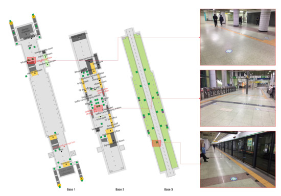 Figure 8 depicts the field experiment that was conducted at Sinjeongnegeori Station in Korea, on Subway Line 2 for the verification of the HMIPS. A total of 60 markers were installed on the first basement floor, 20 markers on the second basement floor, and 18 markers on the third basement floor. These markers were placed on the floor in the form of square stickers with dimensions of 20 × 20 cm. The distance between the consecutive markers was set to 10 m. A total of 540 road guide scenarios were set up with 17 intersection points, 17 attribute change points, and 17 final destinations. In order to get on and off the train and connect with other transportation options, the platform and each exit number were set as the destination. The route network was configured such that it provided a guide from the marker to the final destination. When selecting the final destination, it was set to provide indoor navigation using elevators or escalators. It avoided the stairs on the assumption that users would choose elevator- or escalator-connected exits and platforms.