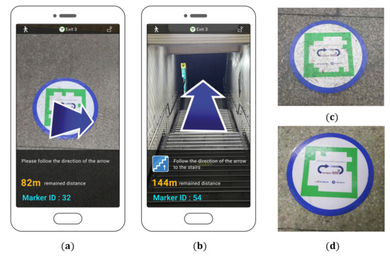 Khan et al. [17] proposed an indoor navigation framework using ARToolKit markers developed in previous research. The provided application was Android-based, with two operating modes: an administrator mode that registered a marker on an indoor map after attaching a marker to the ceiling, and a user mode that searched for directions while recognizing the marker by means of a mobile device. This system is easy to install, use, manage, and expand Android applications, and provides convenience through voice and text guidance. However, the direction of the marker must always be parallel to the direction of the corridor, and the mobile device must always face the ceiling as the marker itself is ceiling-installed. Therefore, this system may experience difficulties in installing markers and place an undesirable burden on users.