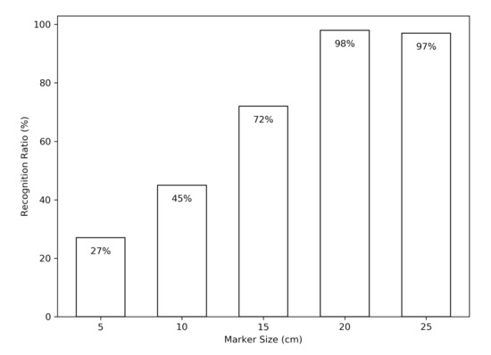 Before finally determining the size of the marker, we experimented with the recognition rate at a height of approximately 1 m by varying the size of the marker. The marker size was increased in 5 cm increments from the smallest size of 5 cm to the largest of 25 cm, and marker recognition was attempted 100 times for each size. Figure 10 shows the recognition rate according to the marker size. As can be seen in Figure 10, a marker size of 5 cm was not practical because it showed a recognition rate of just 27%. It can be seen that the recognition rate gradually increased up to a marker size of 20 cm, but there was little difference above that. Based on this result, we decided to make the final marker size 20 cm and set it as such in the experiment.