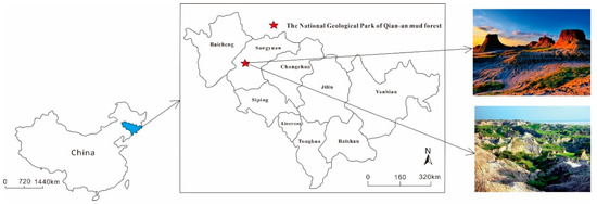 The National Geological Park of Qian-an mud forest is located in the southwest of Qian-an Country, Songyuan City, Jilin Province (Figure 1). It is 40 km away from Qian-an Country, across Suozi Town and Dabusu Town. The coordinates are longitude 123°36′–123°42′ and latitude 44°45′–44°50′, with a total area of 110 km2. Mud forest scenic spot is located in the Dabusu nature reserve, and the area of the mud forest landscape is 7.5 km2.