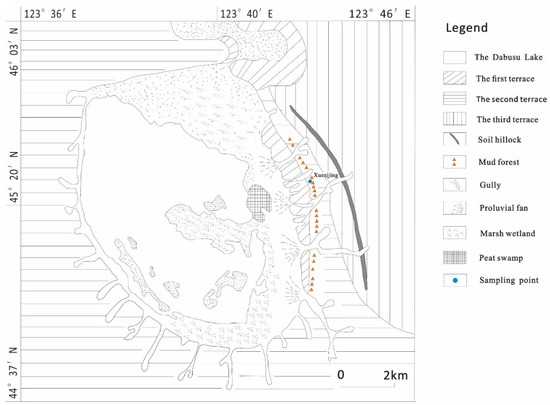 The Songnen Plain, where the Dabusu Lake is located, is a basin type plain that has been continuously settled since Mesozoic and Cenozoic era and accumulated huge thickness of Mesozoic sediments. The basement of Songnen Plain is the metamorphic rock series of the pre-Jurassic period, and the caprock is the meso-Cenozoic deposit with a thickness of 4000–5000 m. According to relevant data, the stratigraphic lithology of Qian-an area is shown in Table 2 [10]. Dabusu mud forest geomorphologic landscape was produced in Guxiangtun formation (upper Pleistocene), consisting in silt, silty clay and clay. The mud forest area is located in the secondary terrace on the east side of Dabusu Lake (Figure 2). This area is located in the middle of the central sag of the secondary structure of the Songliao giant subsidence zone. Soils in the study area are characterized by poor profile differentiation and the area is classified as Cambisols according to the World Reference Base for Soil Resources (WRB) [49].