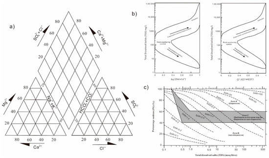 Grain size distribution was measured by a combination of sieving and hydrostatic sedimentation methods. The natural density was measured by cutting ring method. Natural moisture content was measured by means of drying. Liquid limit and plastic limit were determined by the combined determination of liquid limit and plastic limit. Porosity was measured by mercury injection. Major chemical elements were determined via X-ray fluorescence spectrometry following the analytical procedure of Franzini et al. [51] and Leoni and Saitta [52]. This method uses powder pellets and is based on the full matrix correction method. Total volatile components (H2O and CO2) were determined as loss on ignition (LOI) at 950 °C on powders dried at 105 °C [53,54,55]. Considering the high ion content of the soil sample, the double hydrometer method was not suitable, so the dispersibility of the soil sample was determined by Sherard diagram [56]. Several parameters are necessary to determine whether the soil has dispersibility [57,58], among them: the “sodium adsorption ratio”, SAR = Na+/[(Ca2+ + Mg2+)/2]1/2; the “percentage sodium”, PS = [Na+/(Na+ + K+ + Ca2+ + Mg2+)] × 100; the “total dissolved salts”, TDS = Na++ K++ Ca2++ Mg2+. Sherard, Dunnigan and Decker [56] correlated TDS, SAR, PS and clay dispersibility (Figure 4c), according to these authors, the clays of zone A have a high tendency for spontaneous dispersion, the sediments of zone C may be dispersive or nondispersive and the materials of zone B are ordinary erosion-resistant clays [55].