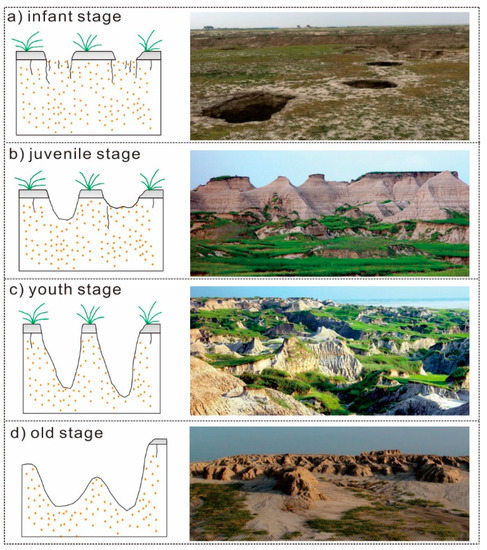 In the next juvenile stage, a large number of holes were formed. With the passage of time and the continuous occurrence of erosion, these holes expanded leading to a destruction of terraces integrity. Gradually, gullies of different sizes and shapes formed, showing accordingly the form of “island” (Figure 5b).