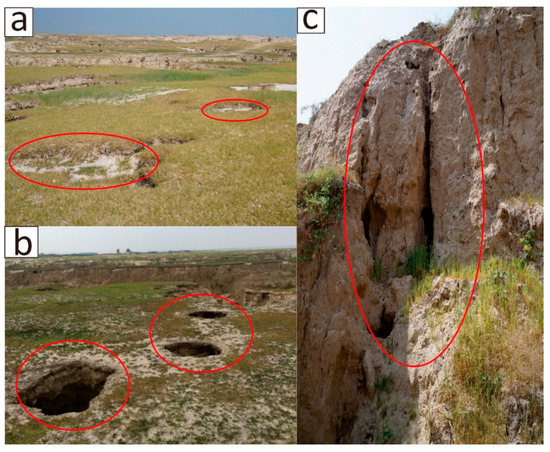 In the infant stage, because of surface erosion, small patches of cultivated soil are destroyed and the vegetation cannot grow. This exposed the loess-like soil directly (Figure 6a). First, the lack of cultivated soil layer makes terrain concave. Precipitation tends to accumulate there. Second, due to the lack of vegetation protection, the exposed loess-like soil is more conducive to rainfall infiltration. Precipitation penetrates along pores and vertical joints (Figure 5a). The eluviation makes the joints and fissures of loess-like soil enlarge. During long years of erosion, small cracks expand to form caves. Due to the special physical and chemical properties of loess-like soil, it is easy to disintegrate and dissolve when meeting water. This causes the soil layer to be vulnerable to subsurface erosion, thus expanding the cave range. Under the action of gravity, the top layer of soil collapses, creating holes (Figure 6b). With the continuation of the subsurface erosion, the sinkholes and the horizontal suffusion caves are developed. Some vertical sinkholes have also been formed (Figure 6c).