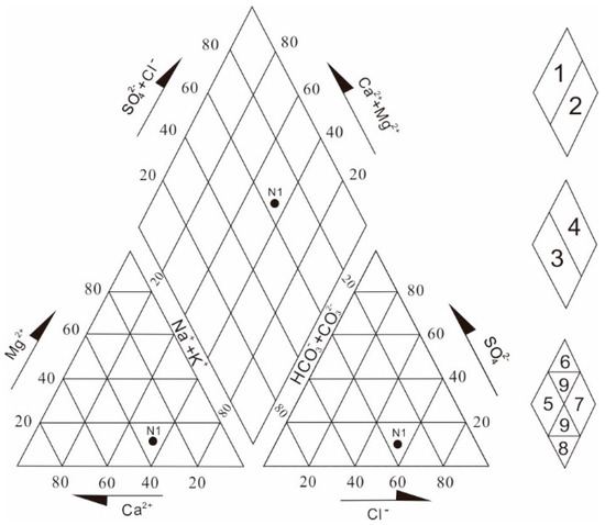 A detailed field survey was conducted in the study area in order to assess different evolution stages of the mud forest landscapes. In order to study the influence of soil on the subsurface erosion in mud forest area, three soil samples were collected between soil pillars at a depth of 10 cm, namely C1, C2, and C3. Three groundwater samples were also collected for experimental study, namely N1, N2, and N3 (Figure 2). The main ions content of groundwater and soluble salt in soil samples were measured. The test methods are shown in Table 3. The groundwater chemistry was analyzed by piper diagrams and categorized by the Gibbs’ model. In the piper diagrams in Figure 4a: (i) In region 1, alkali earth metal ions are greater than alkali metal ions. (ii) In region 2, alkali metal ions are greater than alkali earth metal ions. (iii) In region 3, weak acid root ions are greater than strong acid root ions. (iv) In region 4, strong acid root ions are greater than weak acid root ions. (v) In region 5, the carbonate hardness is greater than 50%. (vi) In region 6, the noncarbonate hardness is greater than 50%. (vii) In region 7, noncarbonate bases are greater than 50%. (viii) In region 8, carbonate base is greater than 50%. (ix) In region 9, no pairs of cation-anion were greater than 50%. Based on the analysis of water in the world’s rivers, lakes and major oceans, Gibbs [50] believes that the controlling factors of ion origin can be divided into rock weathering type, atmospheric precipitation control type and evaporation-concentration type. Figure 4b shows the distribution principle of the Gibbs model.