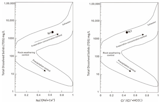 The milligram equivalent percentage of each ion was calculated according to the content of each component of the groundwater (Table 4). It is easy to see that sodium ions account for the largest milligram equivalent percentage of cations, at 55.31%. Calcium ions were the second, accounting for 35.91%. Among the anions, chlorine ions accounted for 55.22%, which was the largest proportion of anions. The bicarbonate ions accounted for 37.92%. Water sample was analyzed by Piper diagrams [57,58]. The sample plots fall under zone 2, 4, and 7 (Figure 7). According to the Shukalev classification method, the groundwater chemistry in the study area is of type HCO3 + Cl-Na + Ca. The calculated Na+/(Na+ + Ca2+) value is greater than 0.6 and Cl−/(Cl− + HCO−3) value is close to 0.5. The groundwater test data was plotted in the Gibbs model. The water sample plots the slightly upper right side of the model center (Figure 8). This reflects that the water characteristics in this region are controlled by evaporation and crystallization.