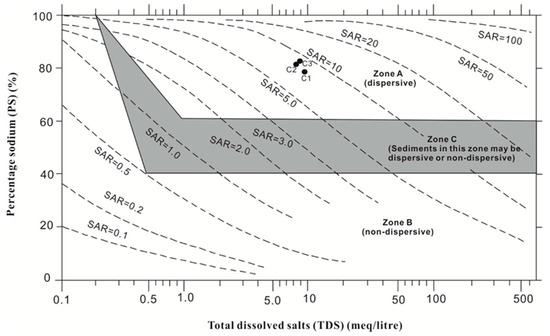 Clay dispersibility is a good indicator of the dispersion vulnerability of soil and, therefore, of the associated risks of soil erosion [57]. The soluble salt composition of soil sample investigated in the present study is given in Table 7, together with the calculated SAR, PS and TDS. The salt composition affects the properties of loess-like soil, especially dispersibility. Plotting of values presented in Table 7 in Sherard diagram clearly shows the zone of soil samples. All samples plot zone A (Figure 10). This indicates that the soil in mud forest area is dispersive.
