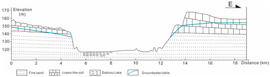 The study area is distributed in the western alluvial plain of the Songnen Plain. The terrain is sloped from east to west and from south to north due to neotectonic movement. The elevation is 150–170 m in the east and 140–155 m in the west. This results in no transit rivers in the Qian-an area. However, a series of lake depressions closely related to the ancient channel are left, forming a relatively independent closed-stream area. In the west of the Songnen Plain, there are many lakes and marshes. Preliminary statistics shows that nearly 700 lakes exist within an area of over 6 km2. Dabusu Lake is a large inland lake among these lakes [10]. Because of the hot weather in summer, the evaporation is much larger than precipitation, which causes a large accumulation of saline and alkaline substances near Dabusu Lake. Dabusu Lake has a low altitude and it is the center of groundwater gathering. Dabusu Lake receives the joint replenishment of atmospheric precipitation, surface runoff and subsurface current. The catchment area is nearly 230 km2, and the lake basin area is about 81 km2. As shown in Figure 2, there are 10 gullies in the west and 4 gullies in the east of Dabusu Lake.