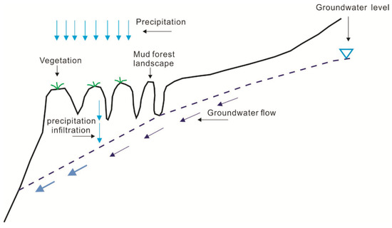 In 2009, the Qian-an mud forest landscape was officially approved as a national geological park in China. Due to its unique landform caused by erosion, this landscape has become the only protected “mud forest” site in China with these geological features, giving the area a high aesthetic and scientific investigation value [46]. However, mud forest is a very fragile geological landscape and suffers from serious soil erosion. In order to maintain mud forest stable for a long time, it is necessary to understand the causes of such landscape degradation. Previous researches on mud forest landscape have been carried out, including the formation mechanism, development and utilization, slope failure. Zhu and Liang [47] preliminarily analyzed the formation mechanism of the mud forest landscape. Zhou, Wang, Ren, Cai and Zhang [10] believed that the formation of the mud forest landscape was related to landform and wind force. On the basis of previous studies, Chi, Wang and Yang [11] proposed that the formation and development of mud forests were not only related to external factors, but also related to soil composition. Zhang et al. [48] concluded that the frost weathering is an important factor in the damage in the region. However, the formation mechanism of the mud forest has not been clearly analyzed since the influence of interflow was ignored in previous studies. In order for this landscape to remain stable for a long time, it is necessary to understand the causes of landscape evolution.