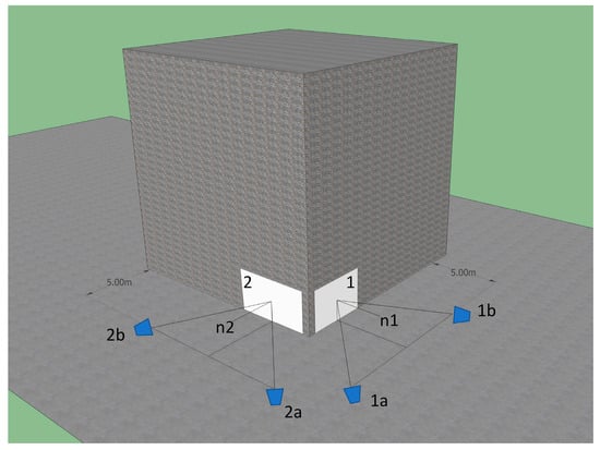 To verify the proposed method, different measurements were carried out on the façade of a corner room using four different loudspeaker positions. The obtained results made it possible to experimentally determine the standardized level differences and to compare them with the simulations. The measurements were performed on a room at the ground floor of the Mathematics Department—University of Brescia, having dimensions of 6 m × 4 m × 2.9 m (Figure 6). An omnidirectional source was placed in four positions outside the room (1a, 1b, 2a, 2b in Figure 7) and a Larson & Davis 831 analyzer was used to measure the sound pressure levels. The reverberation time was measured using the sound level meter and an impulsive source.