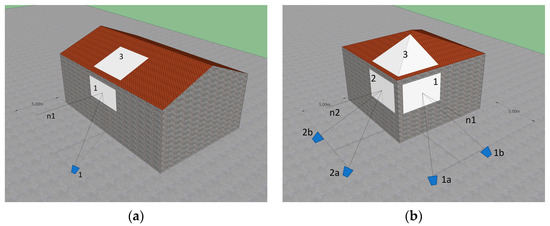 A particular case is presented by the façade of a room featuring a roof. The façade insulation design of rooms involving a roof is not easy to generalize due to several variables. In this case, the façade insulation depends not only on the geometry of the room and on the height of the floor, but also on the inclination and the shape of the roof. This section reports a simplified case of façade attenuation consisting of one wall and a two-pitched roof (Figure 2a) or two walls and a four-pitched square roof (Figure 2b). The loudspeaker is placed on the ground so that only the walls are directly hit by the sound wave. Another option would be to place the loudspeaker high above the ground, but this solution is not often possible and should only be chosen in the case of noise sources that are mainly acting on the roof (for example, fly by of airplanes).