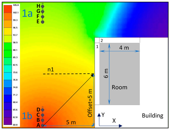 Since in real cases it is uncommon to find a building completely isolated and far from other buildings, the presence of another building placed at 10 m from the façade was simulated with loudspeaker positions “1a” and “1b” (Figure 5). In this case, the simulations show a lower attenuation of the building corner due to the reflections of the additional building.