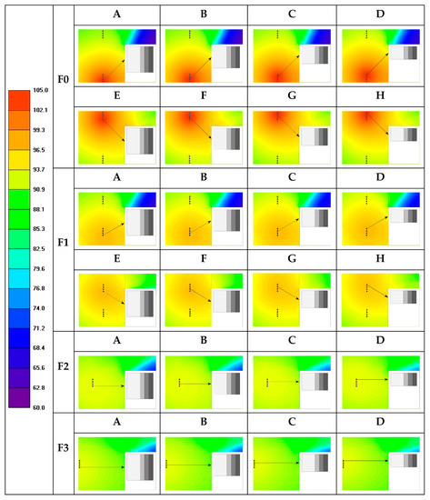 Figure 4 shows the sound pressure level maps for the analyzed cases. It can be noted that, for the lower floors, the level difference between the two sides of the room is higher than in the case of the higher floors. It can be also observed that the sound pressure level decreases for higher floor due to the increasing distance between the loudspeaker and the façade. The effect due to the shielding of the corner and the not negligible attenuation due to the difference in distance between the source and the façade when the source is “in view” of both sides of the façade is clearly visible (see for example F0, position A and E in the sound pressure levels maps of Figure 4).