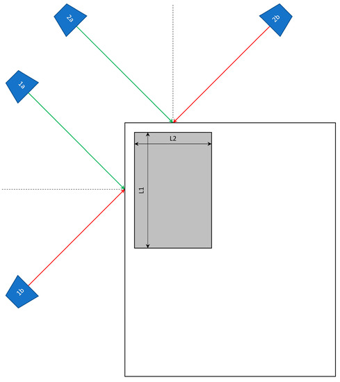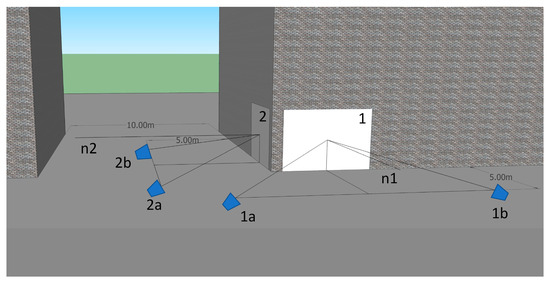 Considering the example in Figure 1, the following four combinations of a source positioned on the ground at a distance of 5 m from the façade can be considered: (a) 1a–2a; (b) 1a–2b; (c) 1b–2a; (d) 1b–2b. Case “a” is expected to lead to the lowest measured value of Dls,2m,nT,w as in the considered positions the source is in direct view of both sides of the façade. On the other hand, case “d” will presumably lead to the highest measured value of the façade acoustic insulation because of the shielding effect of the building corner. Of course, if the final goal is the acoustic protection of the occupants, it is necessary to quantify the above-mentioned differences and, if possible, to provide the most representative value of the façade sound insulation. For a correct interpretation of the façade sound insulation performances, the test report must state which source positions has been chosen during the measurements.