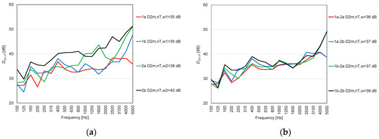 The standardized level difference Dls,2m,nT was computed for the individual loudspeaker positions and for pairs of loudspeaker positions (1a–2a; 1a–2b; 1b–2a; 1b–2b) using Equation (2). Figure 8a shows the results of the measurements for each position of the sound source, while Figure 8b shows the results for the considered pairs of sound source positions. The overall weighted values derived from the measurements in the two cases are shown in Table 5.